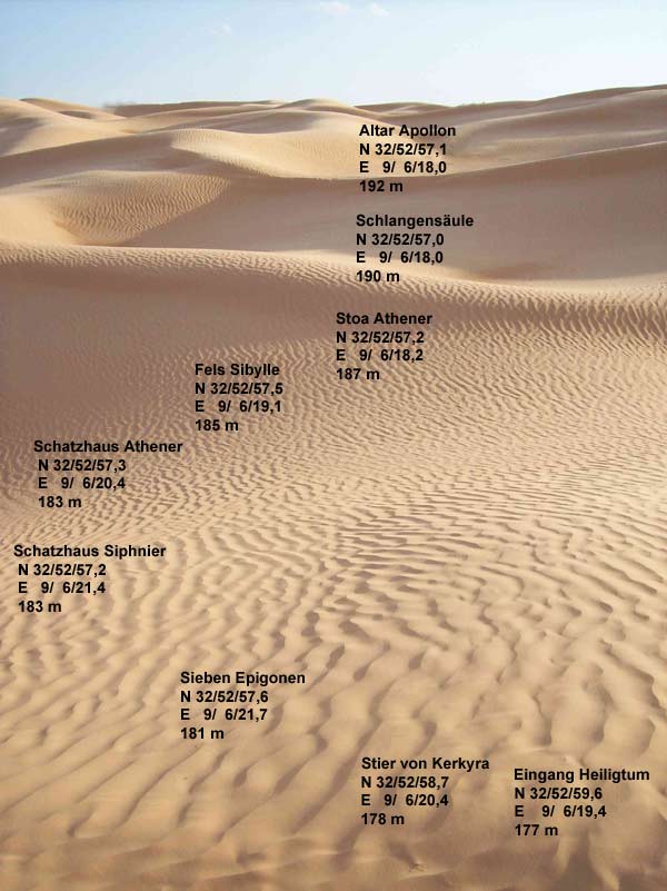 (N=Norden; E=Osten; bei den Koordinaten: 1.Zahl=Grad; 2.Zahl=Minuten; 3.Zahl=Sekunden; Höhe in Metern)